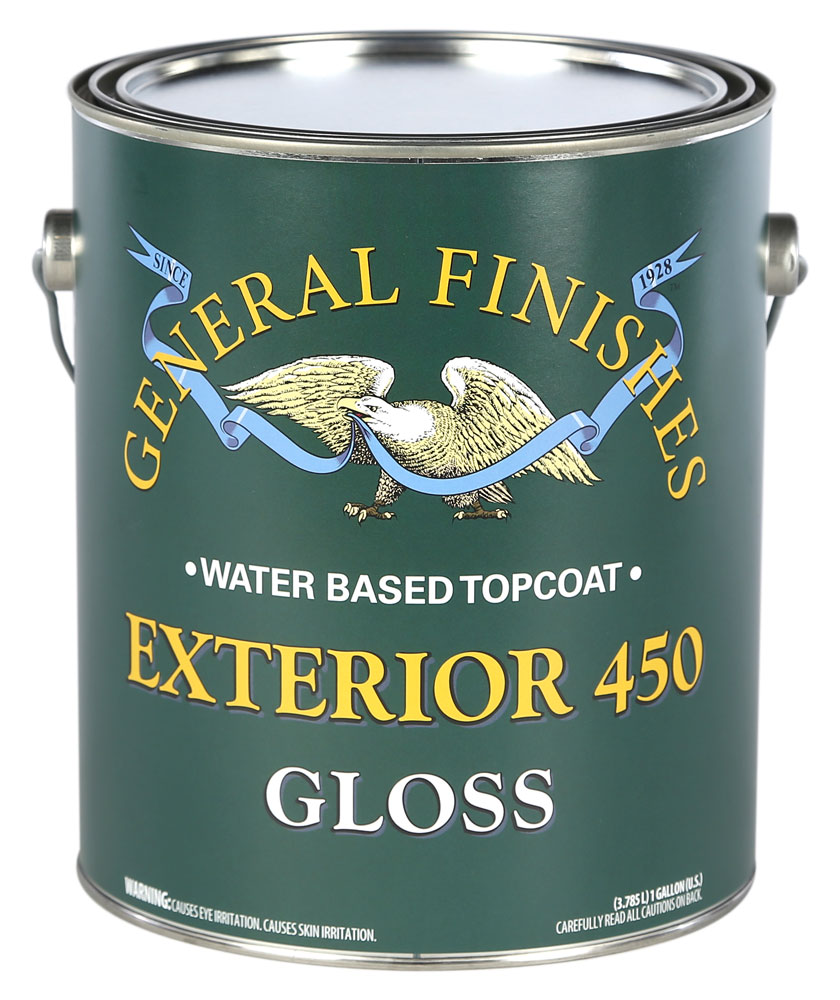 Exterior 450 Topcoat a clear-drying low VOC finish suitable for vertical exterior surfaces, such as fences, patio furniture, garage doors and entrance doors. It is not recommended as a deck finish. Exterior 450 is fortified with UV absorbers to stabilize and protect the integrity the finish*, and built-in mildewcides to slow mold and mildew growth. It performs well as a clear coat or as an optional topcoat over darker colors General Finishes Milk Paint. Do not use over light or white paints as yellowing may occur. *The UV additive in 450 Clear will protect the integrity of the film, but will not prevent the wood from changing color from sunlight. Brush or spray.